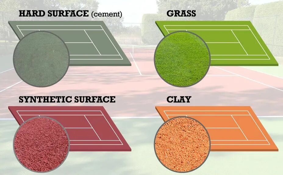 按照網(wǎng)球的四大賽事,溫網(wǎng)、法網(wǎng)、美網(wǎng)和澳網(wǎng),對(duì)應(yīng)的比賽場(chǎng)地分別為草地、紅土、混凝土硬地和硬地。