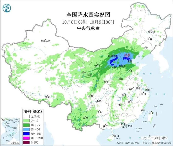 自昨天(10月8日)起,內(nèi)蒙古中部偏南地區(qū)、陜西北部和西南部、山西中北部、河北中北部、北京、天津以及四川盆地西北部、甘肅東部、云南中西部等地部分區(qū)域出現(xiàn)大到暴雨,陜西榆林、河北保定、天津和平區(qū)局地遭遇大暴雨。