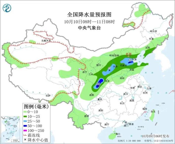 中央氣象臺10月9日6時繼續(xù)發(fā)布暴雨藍色預警:預計10月9日8時至10日8時,陜西北部、山西中北部、河北中部、天津、山東中北部等地部分地區(qū)有大到暴雨,河北西部局地有大暴雨(100到105毫米),上述部分地區(qū)伴有短時強降水(最大小時降雨量20到30毫米)。
