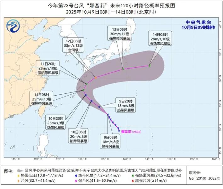 今年第23號臺風“娜基莉”(熱帶風暴級)的中心今天(9日)早晨8點鐘位于琉球群島那霸市東偏南方向約900公里的洋面上,中心附近最大風力有8級(18米/秒)。預計“娜基莉”將以每小時20到25公里的速度向西北方向移動,強度緩慢增強,逐漸向日本以南洋面靠近,并將于11日前后轉(zhuǎn)向東北方向移動。