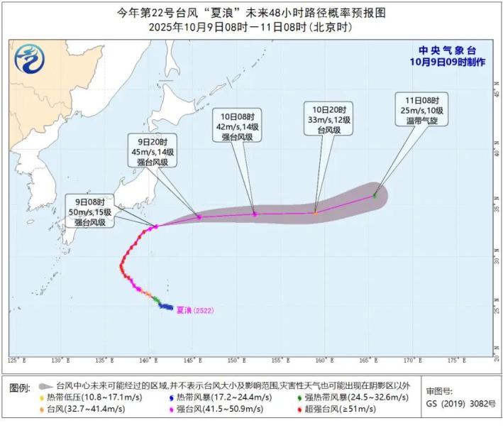下面關(guān)注臺風最新情況。今年第22號臺風“夏浪”今天早晨由超強臺風級減弱為強臺風級,早晨5點鐘其中心位于日本九州島偏東方向約850公里的西北太平洋洋面上,中心附近最大風力有15級(50米/秒)。預計“夏浪”將以每小時35公里左右的速度向東偏北方向快速移動,強度逐漸減弱,未來對我國海域無影響。