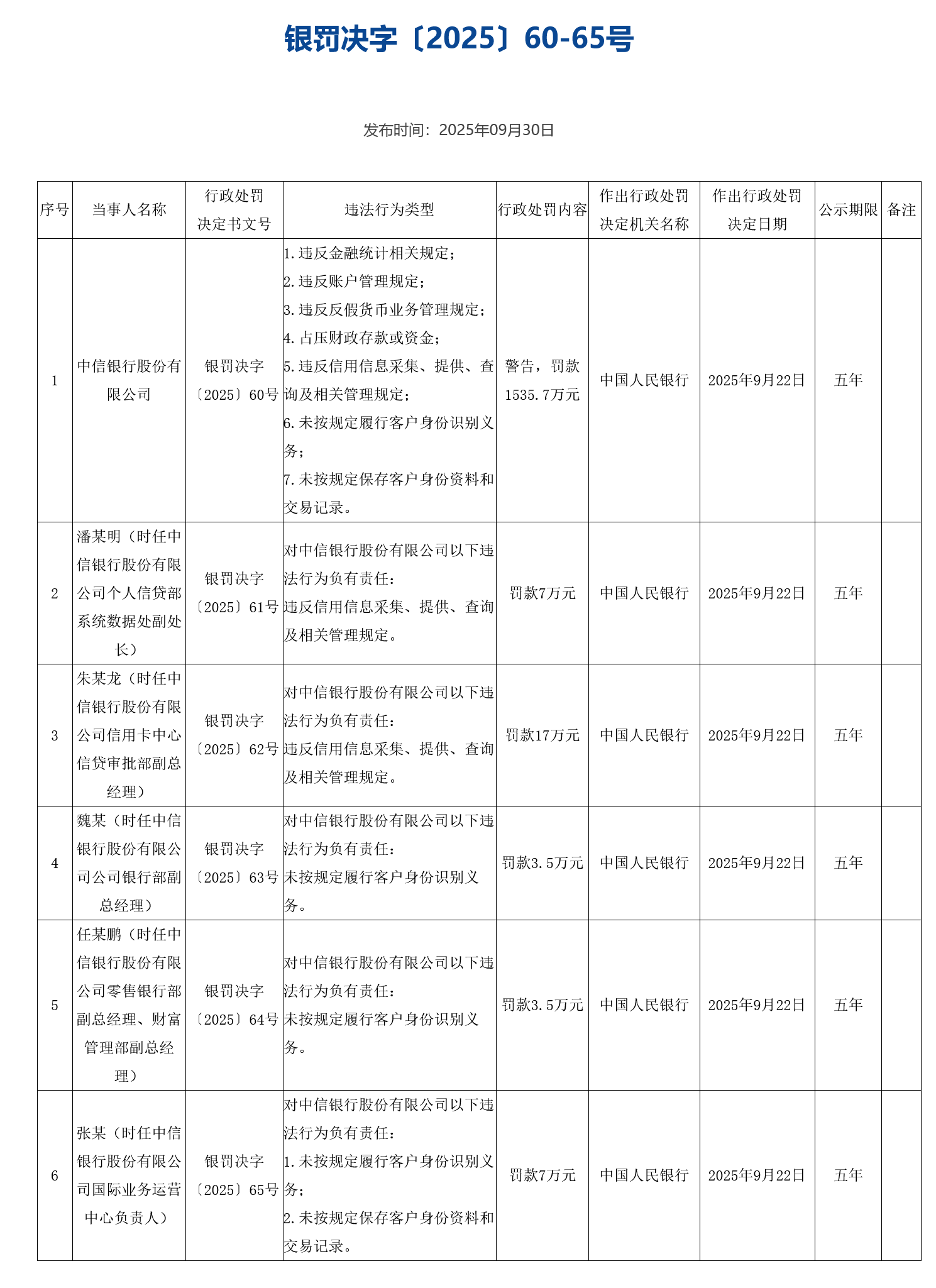 9月30日,中國人民銀行網(wǎng)站發(fā)布《銀罰決字〔2025〕60 - 65號》,行政處罰決定日期為2025年9月22日。