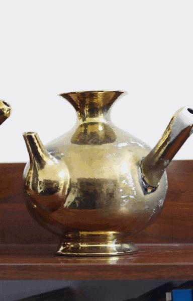 書架上兩個(gè)金色壺的作品,是古希臘陶罐器型和中藥壺的嫁接,這和她爸爸有關(guān)。她和爸爸互相關(guān)心,但有時(shí)互相不理解。