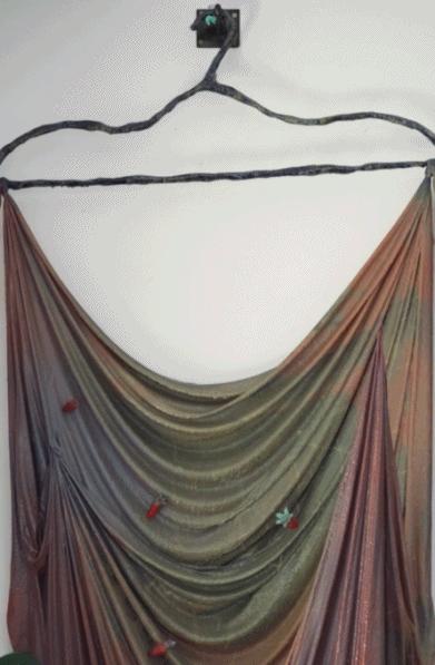 客廳墻上掛的《海洋戰(zhàn)袍》,像古希臘、古羅馬時(shí)期的戰(zhàn)袍造型,象征著遠(yuǎn)行和不斷前進(jìn)。工作臺(tái)前的《在陽光下隨風(fēng)飄蕩 - 石榴園》,靈感來源于上海里弄晾衣桿上被陽光暴曬、風(fēng)吹起的衣服。