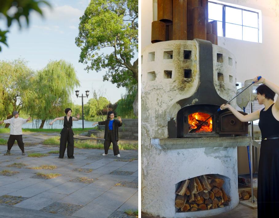 左:和朋友一起打八段錦;右:在面包窯烤面包