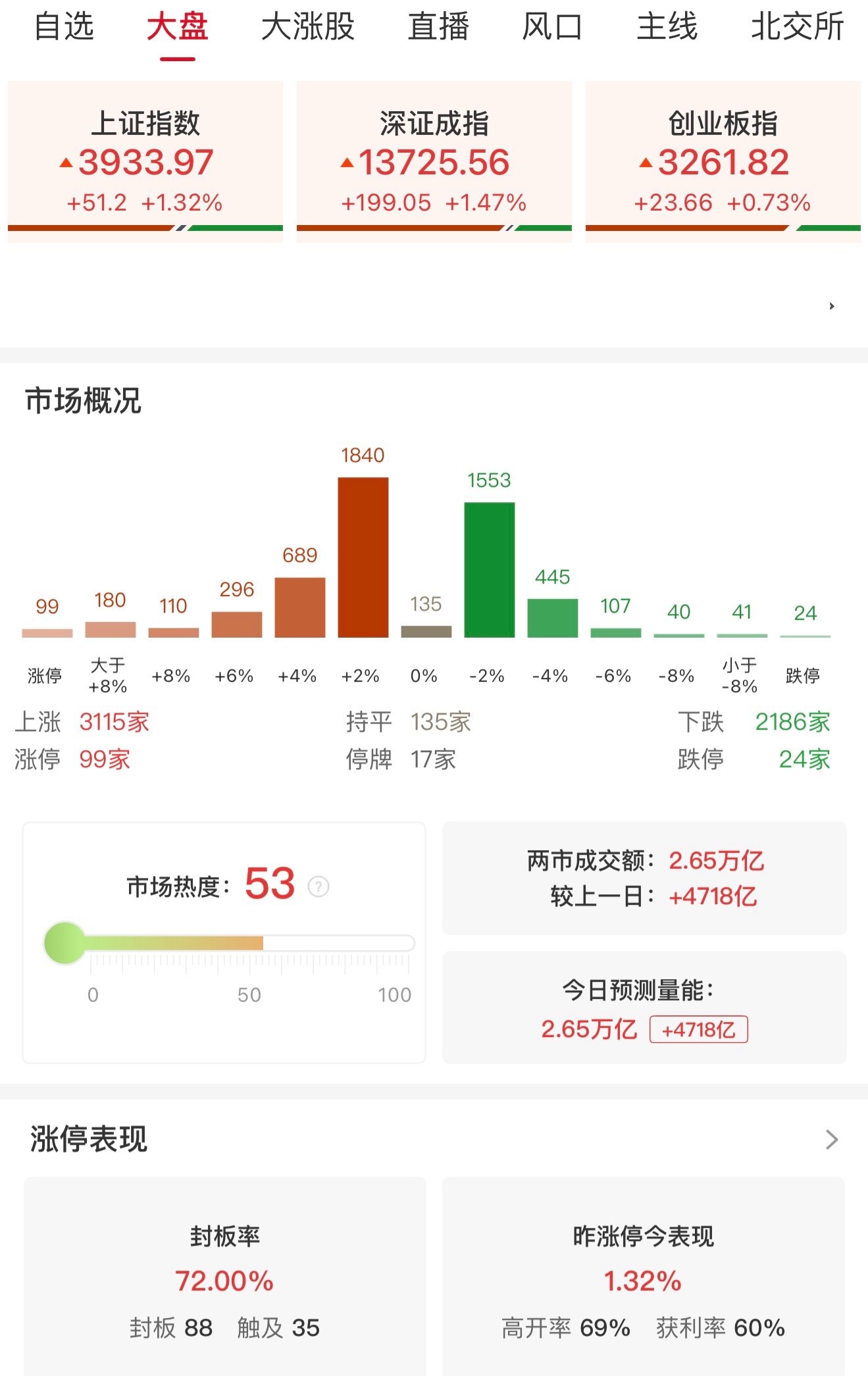 創(chuàng)業(yè)板指和科創(chuàng)50指數(shù)則是沖高后有所回落。滬深兩市的成交額達(dá)到2.65萬億,相較于上一個交易日增加了4718億。收盤時,滬指漲幅為1.32%,深成指上漲1.47%,創(chuàng)業(yè)板指漲幅0.73%。