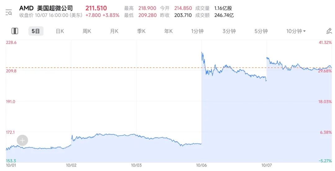 消息傳出,AMD股價(jià)當(dāng)日一度飆升超34%,最終收漲23.71%,市值激增近800億美元,創(chuàng)九年多最大單日漲幅。