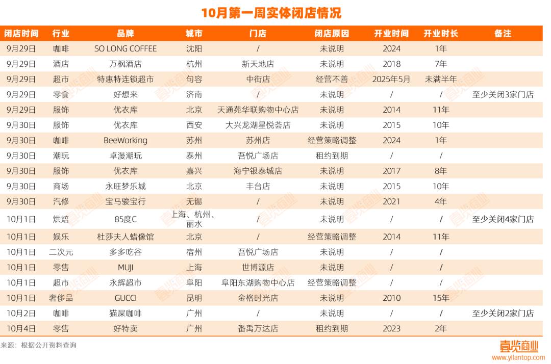 據(jù)壹覽商業(yè)不完全統(tǒng)計(jì),10月第一周,17個(gè)品牌關(guān)閉了至少25家門(mén)店。