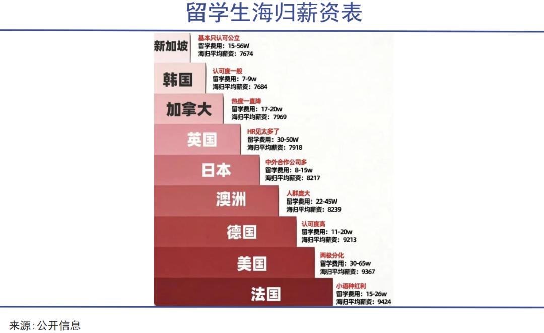 社交媒體上流傳的海歸薪資表顯示,美、英、澳、日等熱門(mén)留學(xué)國(guó)家的海歸平均薪資集中在8000元左右。這個(gè)數(shù)字單獨(dú)看不算低,但與動(dòng)輒幾十萬(wàn)乃至上百萬(wàn)的留學(xué)投入相比,性?xún)r(jià)比很低。