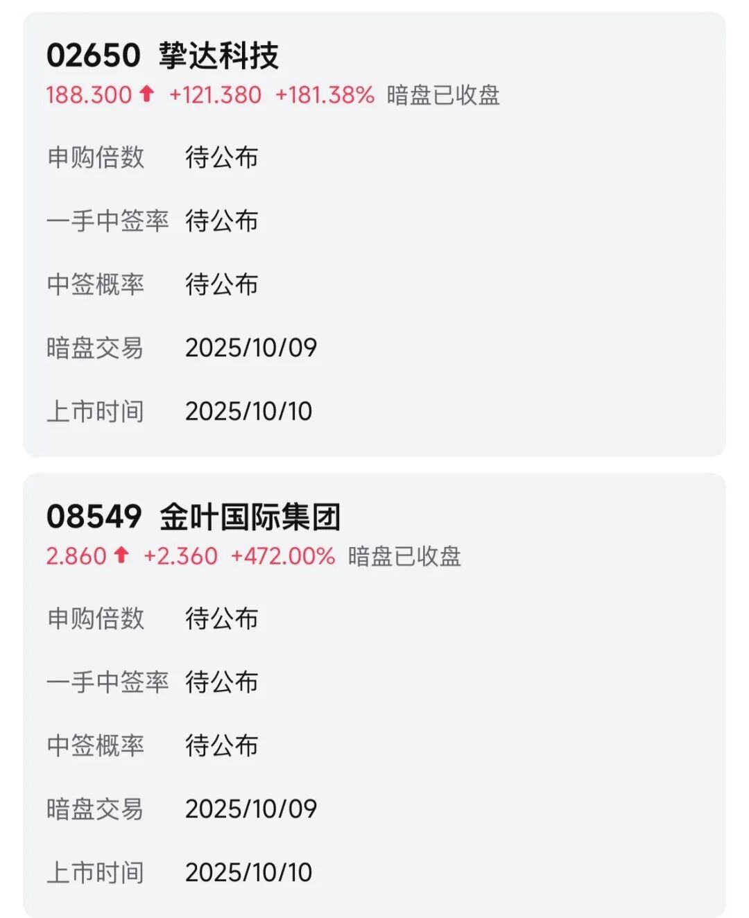 10月10日,有兩只新股即將正式在港股市場掛牌上市。然而,在10月9日晚間的暗盤階段,這兩只新股就已經(jīng)漲勢驚人!