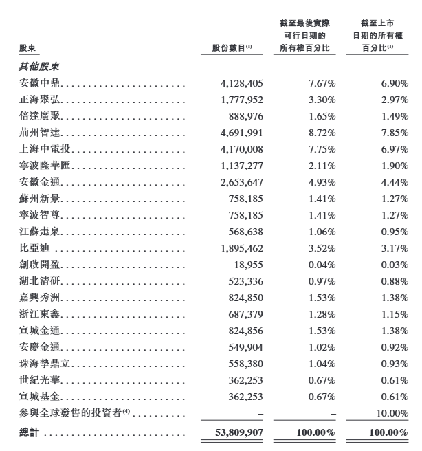 此外,在摯達科技的股東層面,公司與首次公開發(fā)售前投資者進行了多輪首次公開發(fā)售前投資,投資者包括安徽中鼎、荊州智達、上海中電投、金通資本、比亞迪等。