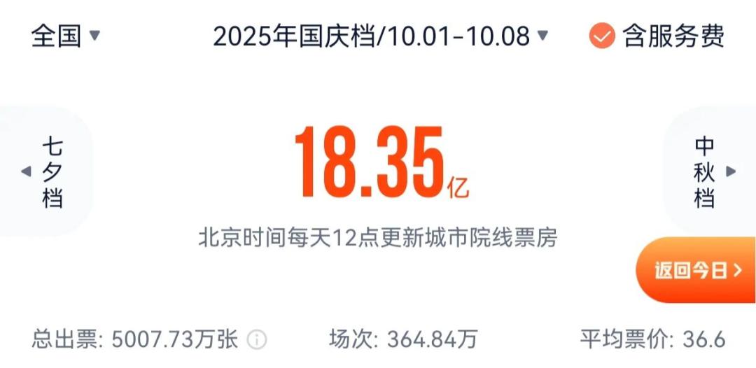 據燈塔專業(yè)版數據,國慶八天總票房為18.35億元,五部影片過億,平均票價35.8元,觀影人次超5000萬,數據表現平平,票房與2015年(7天)的18.62億接近。因此,各路媒體紛紛發(fā)出“國慶檔票房崩塌”“票房退回十年前”等聲音。