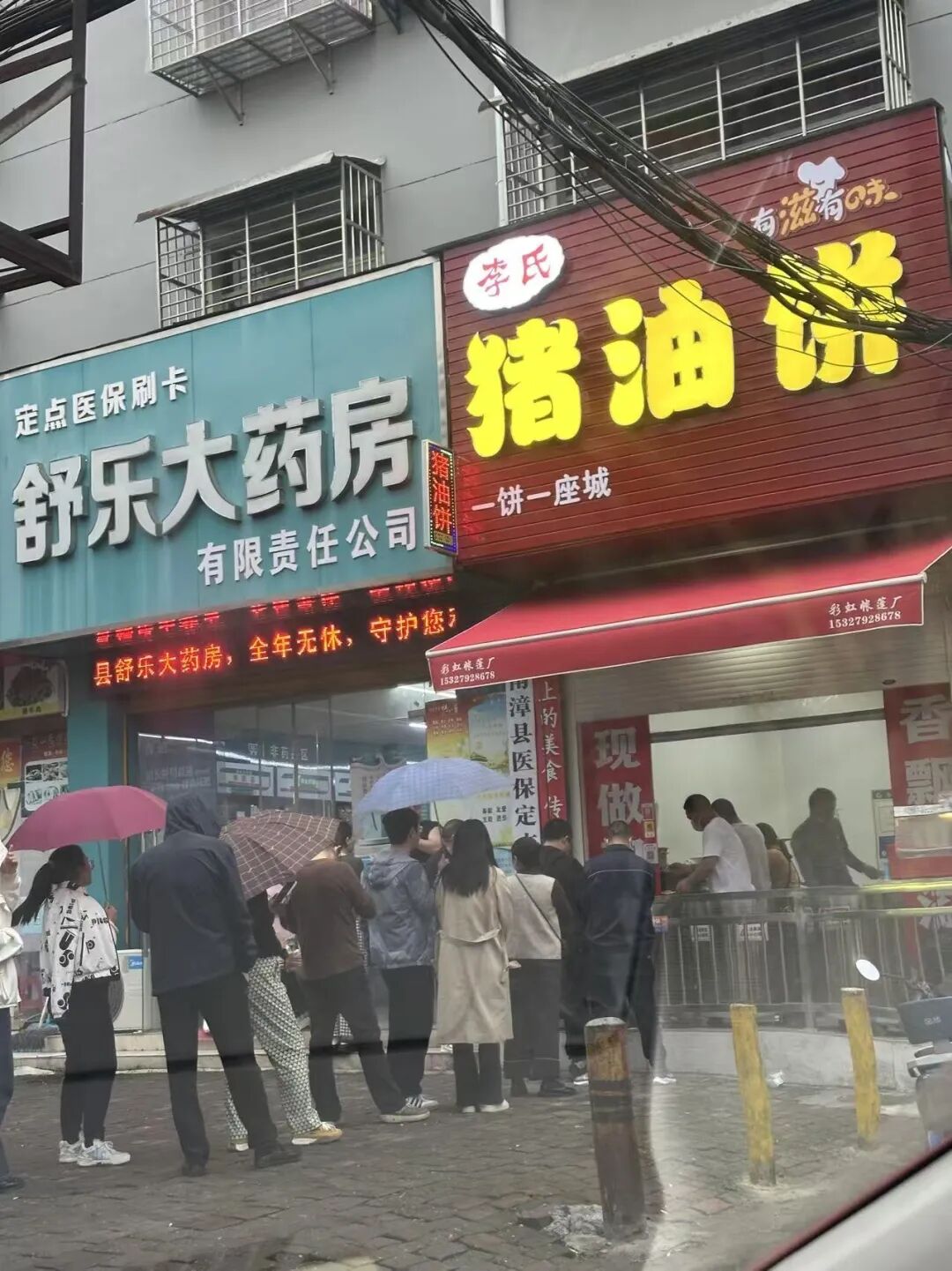 在我們老家,有一種特色小吃叫做“豬油餅”,這種餅在制作時(shí)要先把餡料準(zhǔn)備好,搟成片狀并在一面撒上芝麻,最后將無芝麻的一面貼進(jìn)陶缸爐膛,用木炭火烤約3分鐘方可食用。這種制作工藝就意味著必須趁剛出爐時(shí)吃才好吃。當(dāng)我在高德“煙火小店”榜上找到這家位于背街里弄的豬油餅店時(shí),下著小雨門口還有20幾個(gè)人在排隊(duì)。