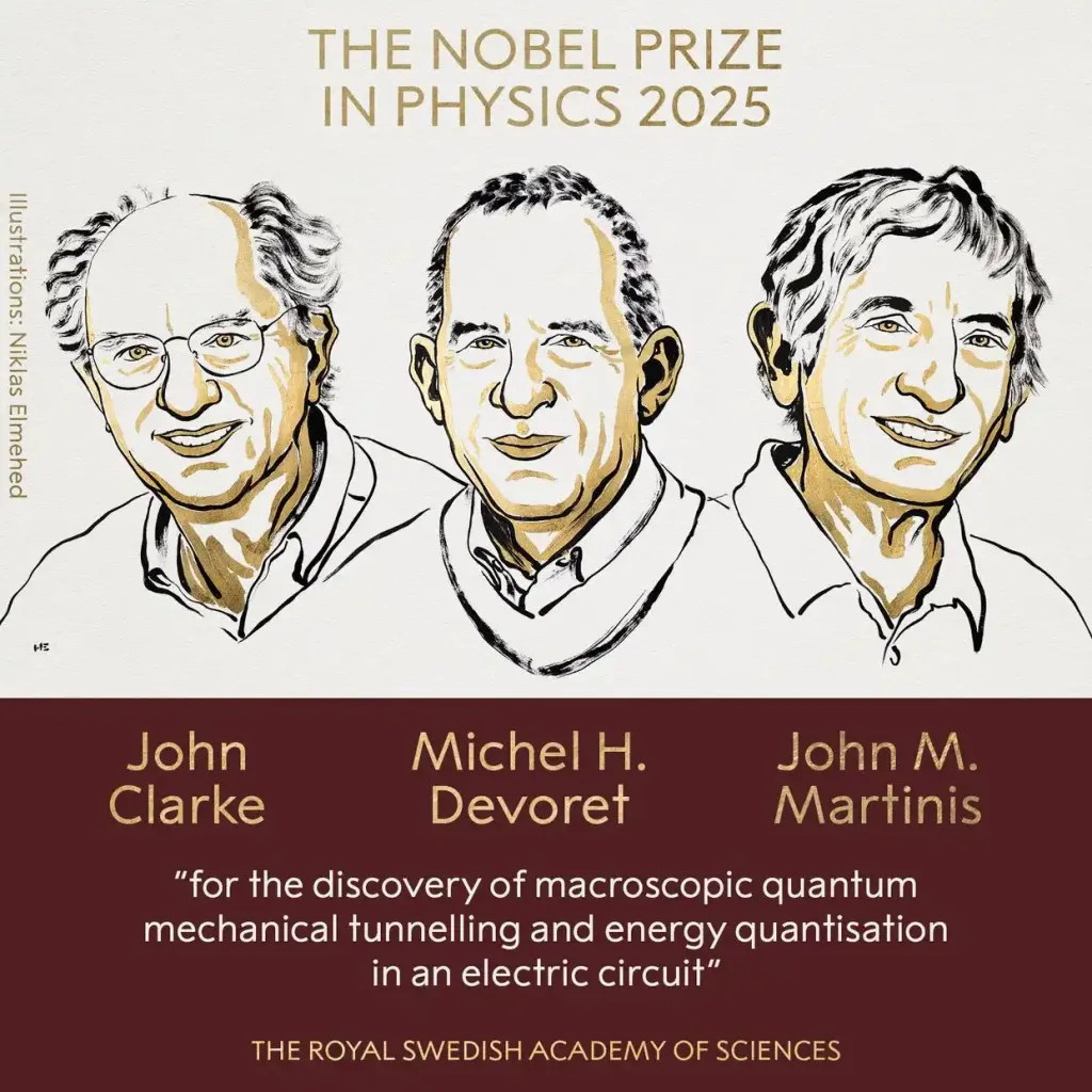 當(dāng)?shù)貢r(shí)間10月7日,瑞典皇家科學(xué)院宣布,將2025年諾貝爾物理學(xué)獎(jiǎng)授予約翰·克拉克(John Clarke)、米歇爾·H·德沃雷特(Michel H. Devoret)、約翰·M·馬蒂尼斯(John M. Martinis)三位科學(xué)家,以表彰他們“發(fā)現(xiàn)電路中的宏觀量子力學(xué)隧道效應(yīng)和能量量子化”。