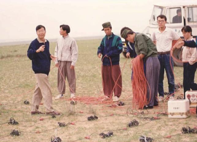 1994年,李慶忠(左1)在內(nèi)蒙古進(jìn)行野外高分辨率地震采集實(shí)驗(yàn)