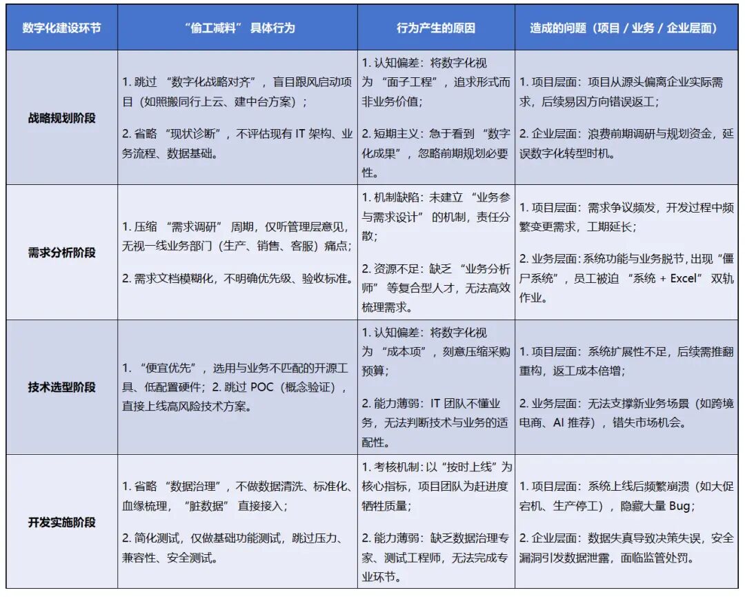 那么,企業(yè)數(shù)字化建設(shè)過(guò)程中有哪些“偷工減料”的行為呢?