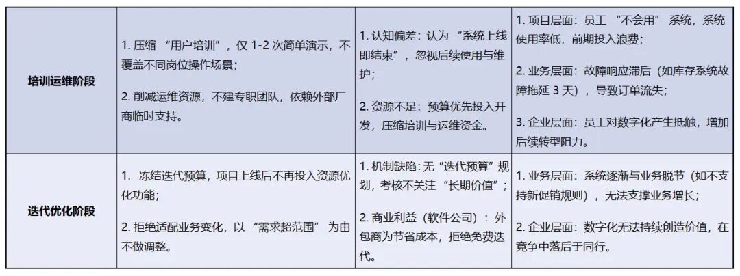 系統(tǒng)上線后,運(yùn)營(yíng)方面嚴(yán)重“偷工”,表現(xiàn)為“責(zé)任模糊、考核錯(cuò)位、管控缺失”,數(shù)字化項(xiàng)目成了“看似誰(shuí)都在管,實(shí)則沒人管,出了問(wèn)題誰(shuí)都不管”的“三不管”地帶。