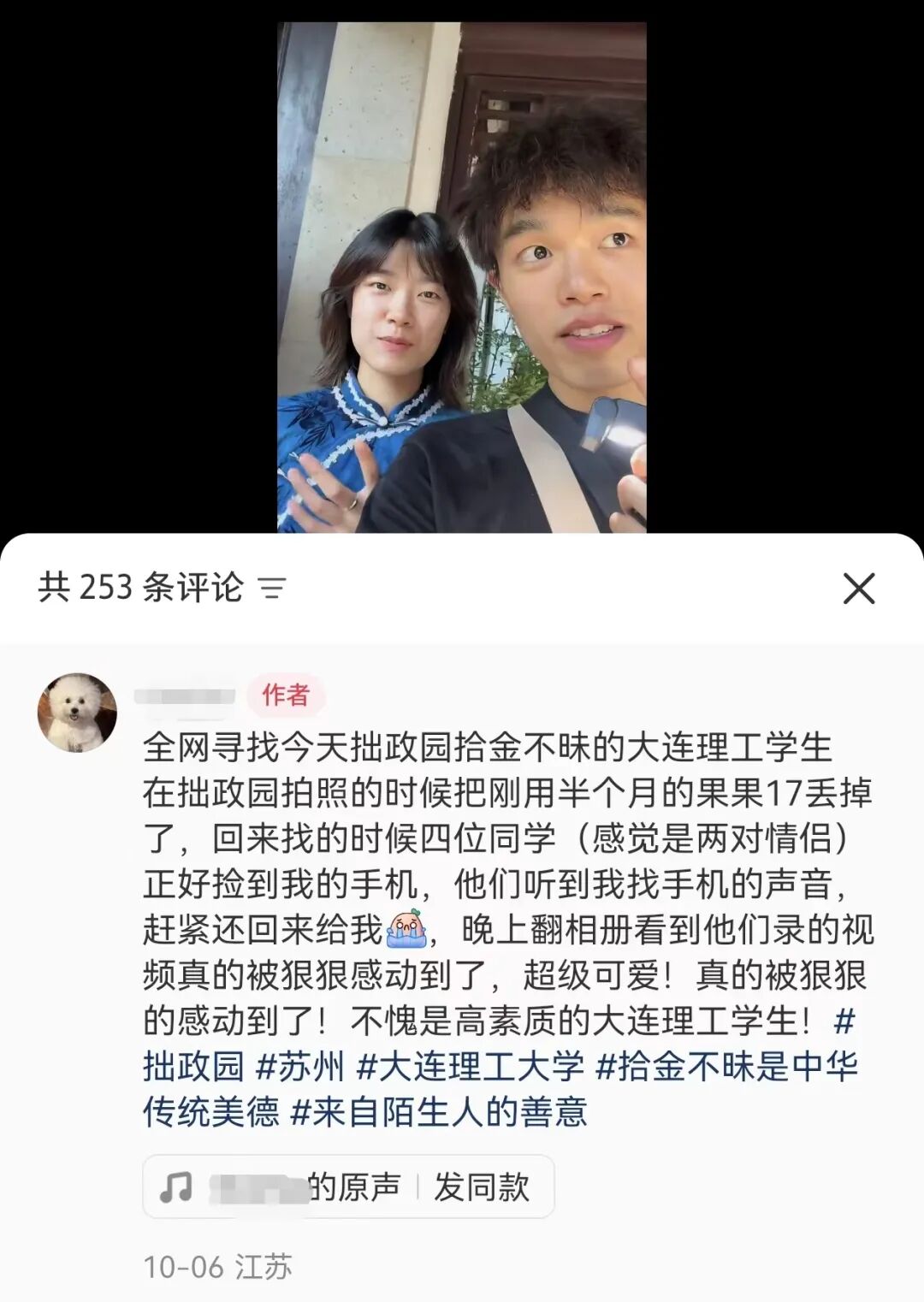 發(fā)帖人激動講述,國慶假期在蘇州拙政園游玩時,不小心遺失了新手機。四位大學(xué)生撿到后主動歸還,隨后匆匆離去。