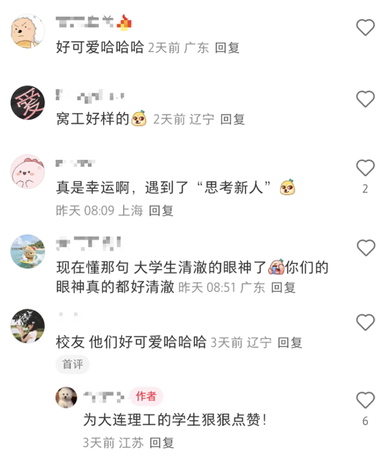 網(wǎng)友們好奇這四位眼神清澈又善良的同學(xué)是誰,視頻背后有什么有趣故事。帶著大家的關(guān)心和好奇,我們找到了來自大連理工大學(xué)的三位主角(另一位同學(xué)是他們朋友,在兄弟高校就讀),分別是信息與通信工程學(xué)院大四學(xué)生康遠(yuǎn)悅、大三學(xué)生伍思文,以及集成電路學(xué)院大三學(xué)生保子涵。讓我們聽聽他們講述那天的奇妙故事。