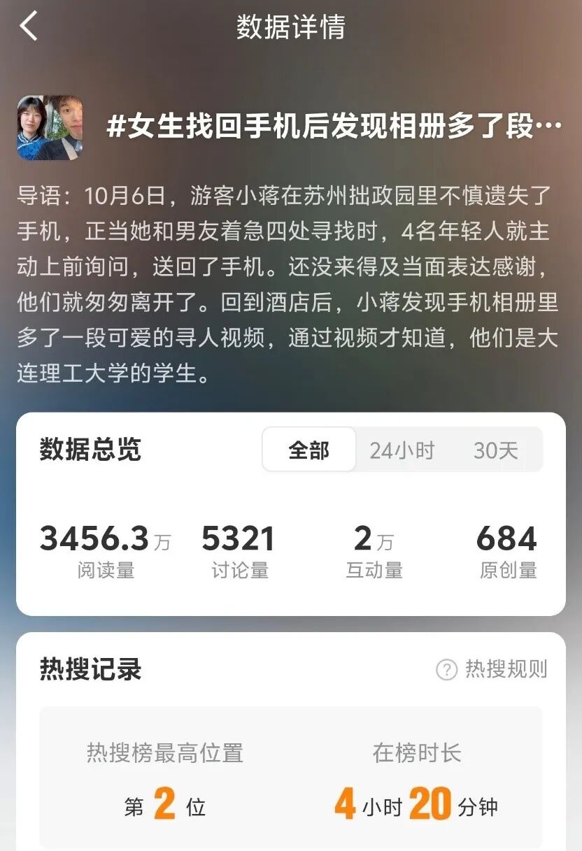 失主回到酒店,發(fā)現(xiàn)手機相冊里多了一段可愛的尋人視頻,從視頻得知他們是大連理工大學(xué)的學(xué)生。失主將視頻發(fā)上網(wǎng),講述這段暖心有愛的經(jīng)歷,沒想到意外火了,相關(guān)話題登上微博熱搜榜第2位。