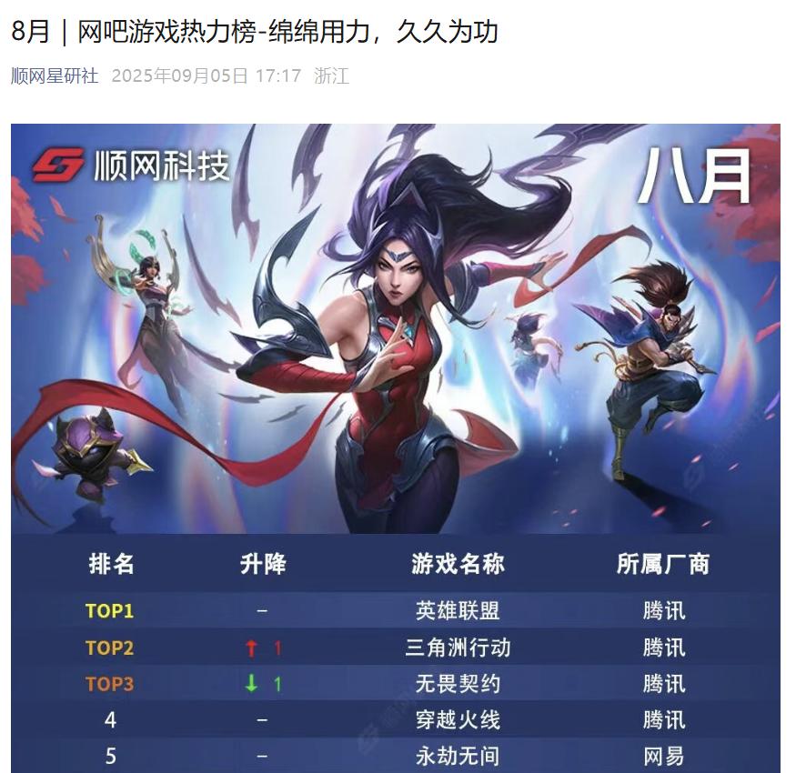 順網(wǎng)星研社發(fā)布的網(wǎng)吧游戲熱力榜顯示,今年8月起,《三角洲行動》超越《無畏契約》,躋身榜單第二位,這也是《無畏契約》自2024年10月登上榜單第二位后首次下滑。