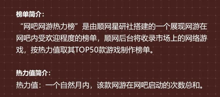 順網(wǎng)熱力值榜單計算“一個自然月內(nèi),該款網(wǎng)游在網(wǎng)吧啟動的次數(shù)總和”,其排位不絕對代表游戲火爆程度,只反映大致趨勢,玩家在網(wǎng)吧游玩情況不同。