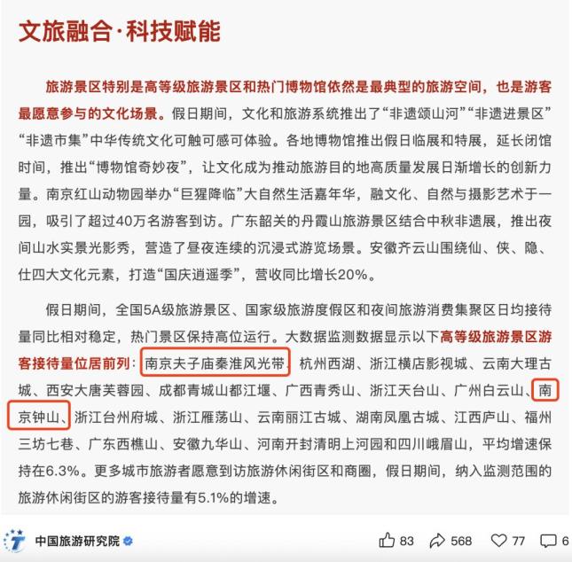 10月9日,中國旅游研究院發(fā)布的相關調研報告顯示,在國慶中秋假期全國高等級旅游景區(qū)游客接待量排行榜上,夫子廟—秦淮風光帶位列第一名,鐘山風景區(qū)位列第十名。
