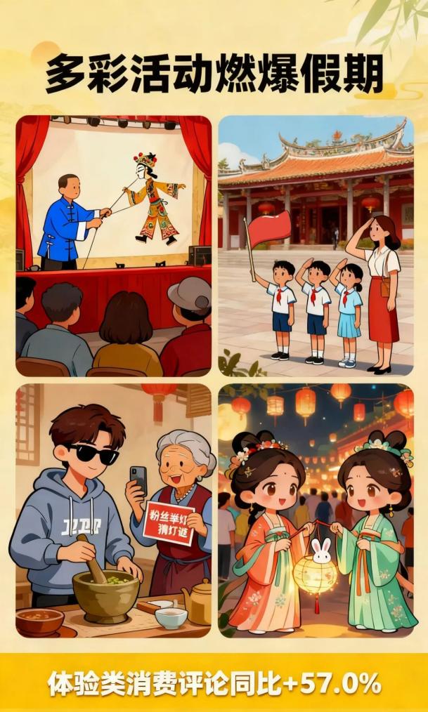 多元的文旅活動(dòng)進(jìn)一步點(diǎn)燃了消費(fèi)熱情。非遺皮影戲展演、沙灘音樂節(jié)、中秋燈會(huì)等活動(dòng)輪番上演,海豐紅宮紅場(chǎng)成為親子游的熱門選擇。真人秀節(jié)目明星“姐姐們”體驗(yàn)本地漁歌、擂茶等特色文化,推動(dòng)體驗(yàn)類消費(fèi)評(píng)論量增長(zhǎng)57.0%。