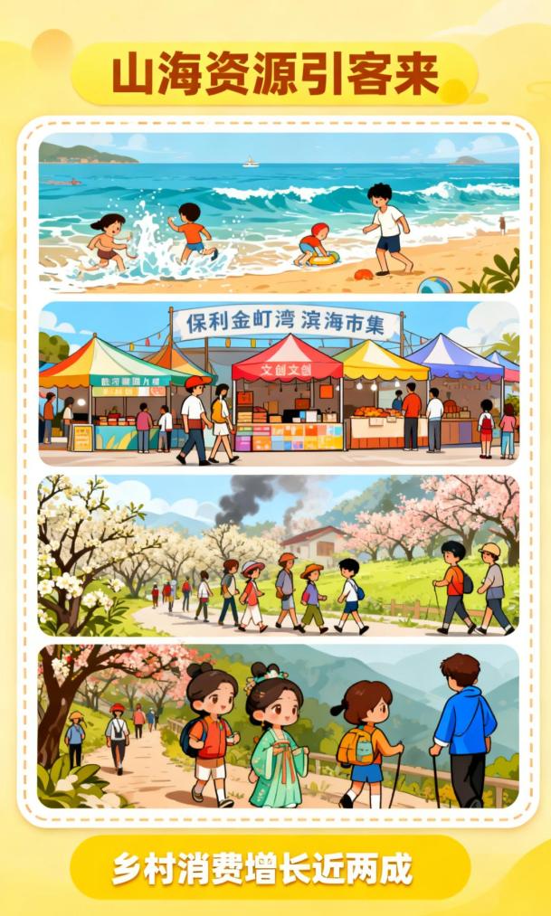 汕尾的山海資源是吸引游客的“金字招牌”。紅海灣的浪花和沙灘匯聚了大量人氣,保利金町灣的濱海項(xiàng)目和特色市集讓游客樂而忘返。陸河螺洞世外梅園、觀天嶂等生態(tài)景區(qū)也迎來(lái)了眾多渴望“森呼吸”的游客,帶動(dòng)鄉(xiāng)村民宿和農(nóng)家樂消費(fèi)增長(zhǎng)近兩成。