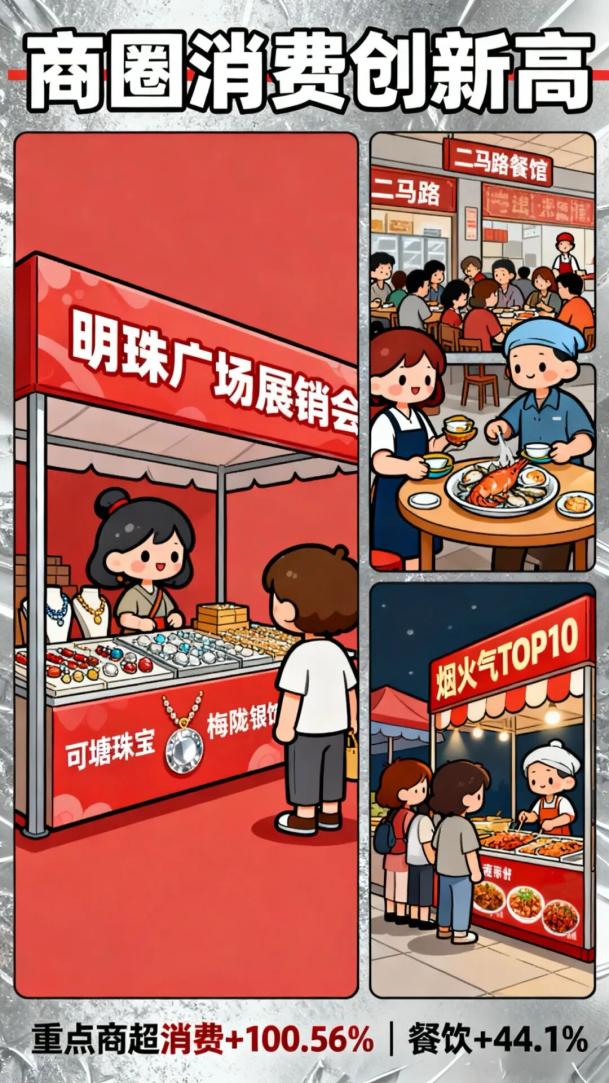 商圈消費(fèi)創(chuàng)下新高。明珠廣場(chǎng)、顯達(dá)廣場(chǎng)人潮涌動(dòng),跨境電商展銷會(huì)助力可塘珠寶、梅隴銀飾等本土優(yōu)品走向更廣闊的市場(chǎng)。重點(diǎn)商圈人流量超66萬(wàn)人次,同比增長(zhǎng)18.8%,消費(fèi)額實(shí)現(xiàn)翻倍增長(zhǎng),達(dá)到3395萬(wàn)。