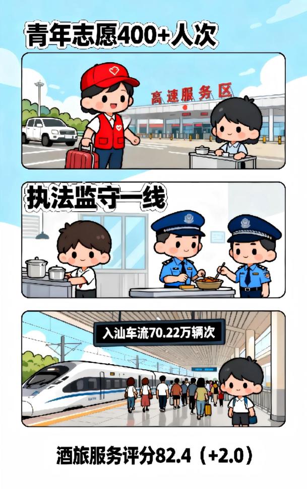 優(yōu)質(zhì)的服務(wù)為消費(fèi)熱力保駕護(hù)航。交通部門高效應(yīng)對(duì)客流高峰,鐵路到達(dá)旅客20.34萬(wàn)人次,高速公路入汕車流達(dá)70.22萬(wàn)輛次。市場(chǎng)監(jiān)管與商務(wù)服務(wù)隊(duì)伍堅(jiān)守一線,保障消費(fèi)環(huán)境安全有序,酒旅服務(wù)質(zhì)量評(píng)分提升至82.4分!超過400人次的青年志愿者活躍在高鐵站、紅海灣等重點(diǎn)區(qū)域,提供暖心服務(wù),成為假日里一道亮麗的風(fēng)景。