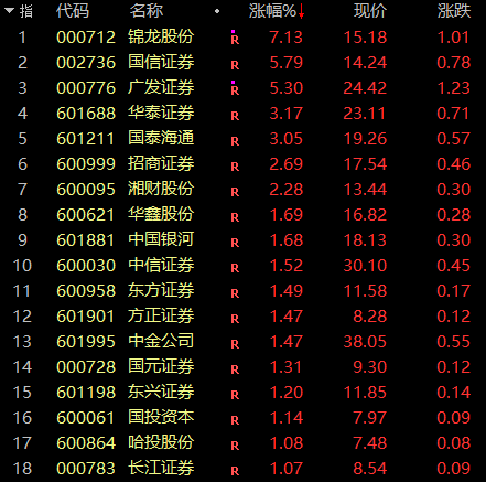 券商板塊盤中快速沖高,錦龍股份漲超7%,國信證券、廣發(fā)證券漲逾5%,國泰海通、招商證券紛紛上揚。