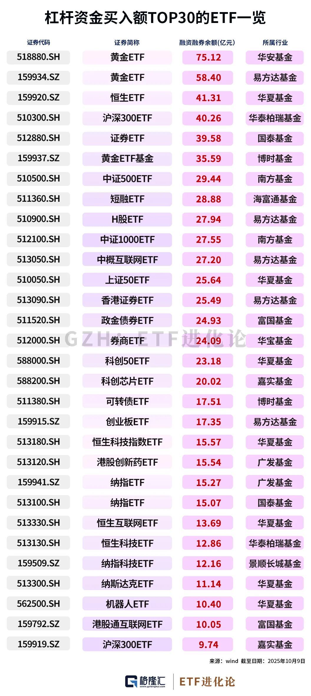 杠桿資金買(mǎi)入額前10的ETF分別為:華安黃金ETF、易方達(dá)黃金ETF、華夏恒生ETF、華泰柏瑞滬深300ETF、國(guó)泰證券ETF、博時(shí)黃金ETF基金、南方中證500ETF、海富通短融ETF、易方達(dá)H股ETF、南方中證1000ETF。