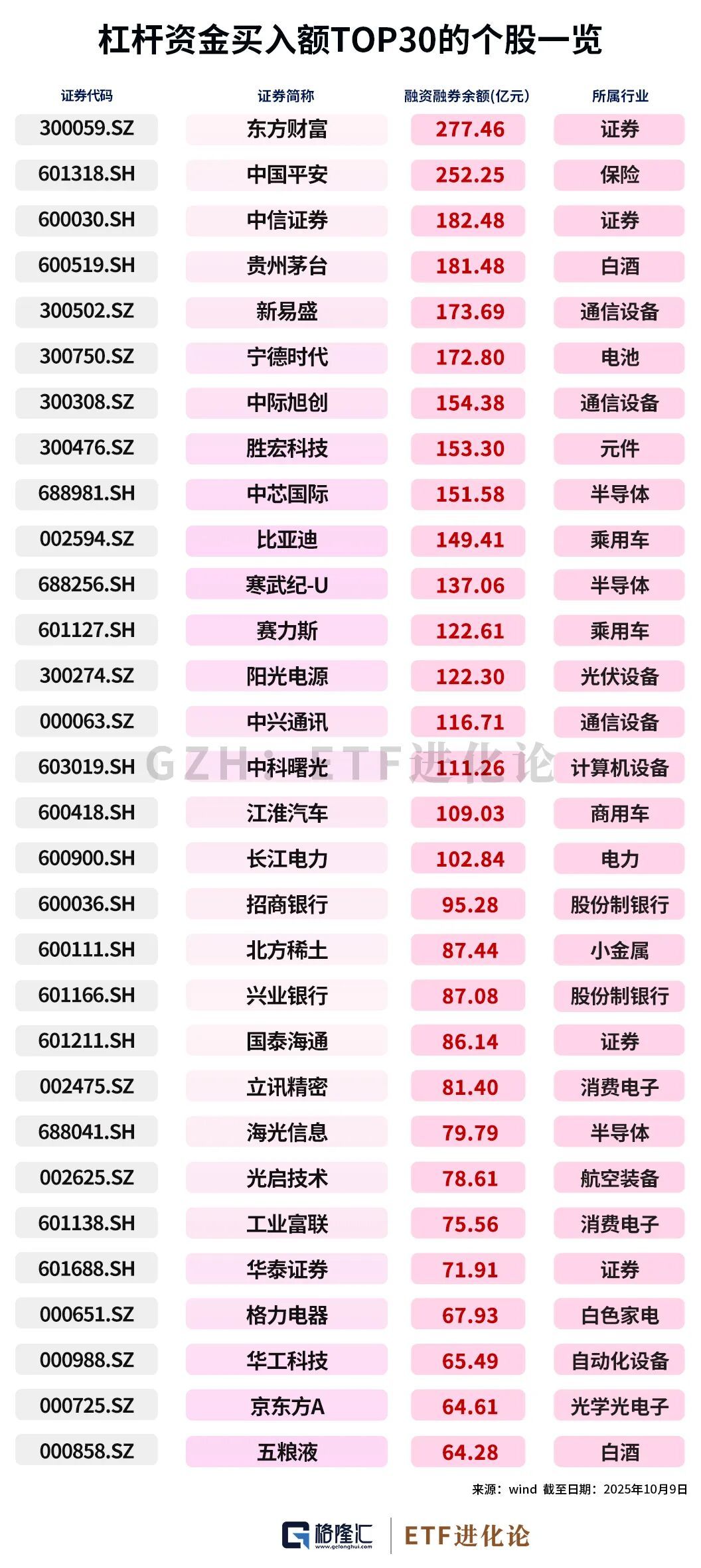 截至10月9日,杠桿資金買(mǎi)入額前10的個(gè)股分別為:東方財(cái)富、中國(guó)平安、中信證券、貴州茅臺(tái)、新易盛、寧德時(shí)代、中際旭創(chuàng)、勝宏科技、中芯國(guó)際、比亞迪。
