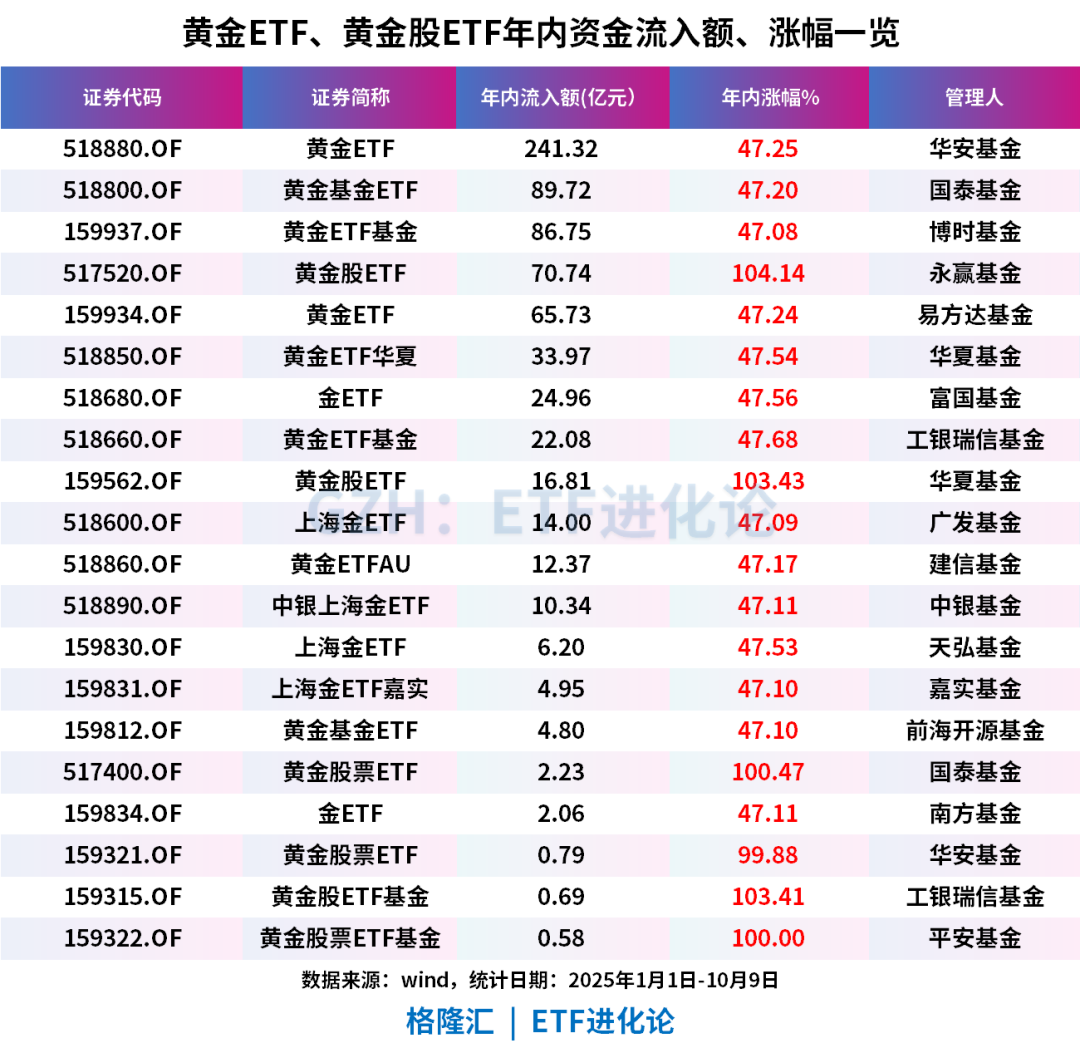截至10月9日,A股黃金股ETF、黃金ETF基金、金ETF年內(nèi)大幅上漲,超過(guò)711億元資金凈買(mǎi)入黃金相關(guān)ETF。