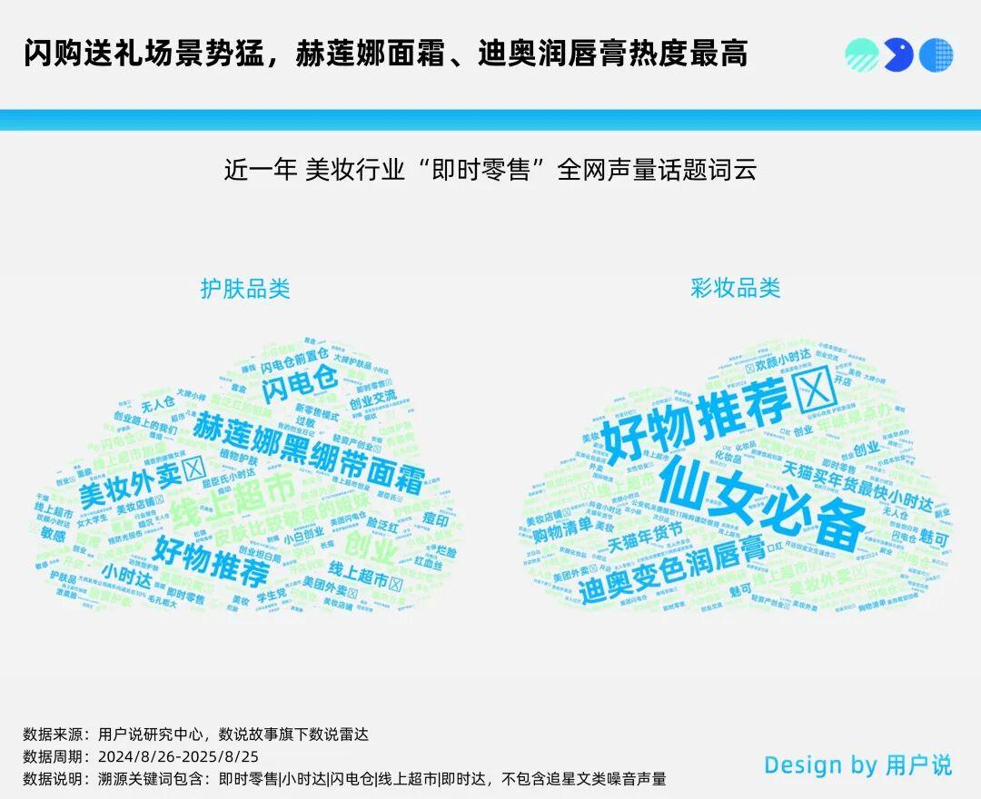 除“快”之外,很多急迫場景離不開即時(shí)零售。比如送禮,情人節(jié)、母親節(jié)等節(jié)日臨時(shí)想起沒準(zhǔn)備禮物,傳統(tǒng)網(wǎng)購時(shí)效無法滿足,即時(shí)零售可解燃眉之急。用戶說數(shù)據(jù)顯示,赫蓮娜黑繃帶、迪奧變色潤唇膏在即時(shí)零售中討論度高,適合送禮,下單1小時(shí)內(nèi)送達(dá),避免尷尬。