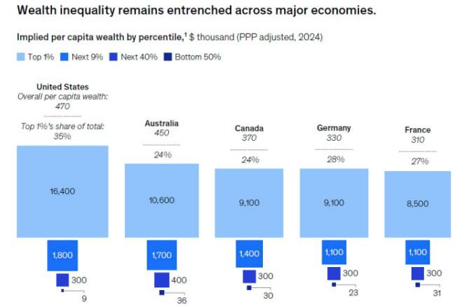 但該數(shù)字與實際經(jīng)濟(jì)表現(xiàn)脫節(jié)加劇——從25年前全球GDP的4.7倍擴(kuò)大至如今的5.4倍。財富集中度驚人,前1%的富翁擁有全球五分之一財富。