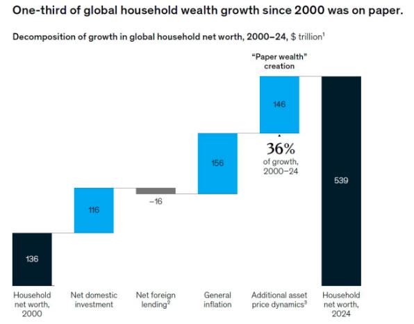 麥肯錫稱,本世紀(jì)初以來,全球財富增長400萬億美元,超三分之一是賬面收益,與實體經(jīng)濟(jì)脫鉤,約40%源自通脹,僅30%反映實體經(jīng)濟(jì)新投資。即一美元新投資創(chuàng)造3.5美元新增家庭財富。