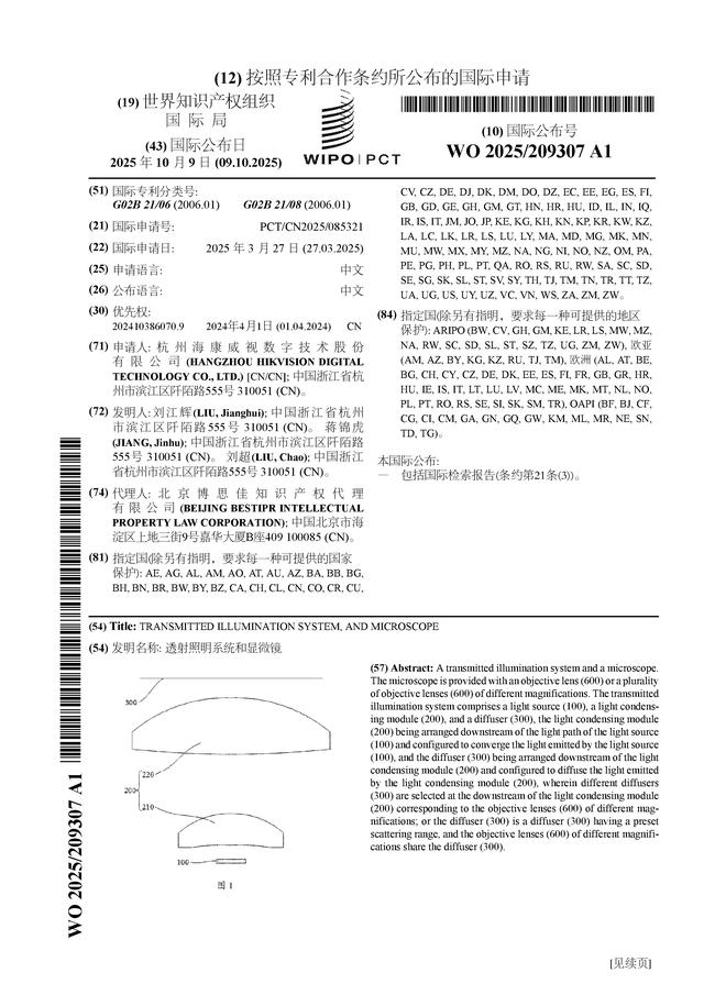 證券之星消息,據(jù)企查查數(shù)據(jù)顯示,??低暎?02415)公布了一項國際專利申請,專利名稱為“透射照明系統(tǒng)和顯微鏡”,專利申請?zhí)柺荘CT/CN2025/085321,國際公布日為2025年10月9日。