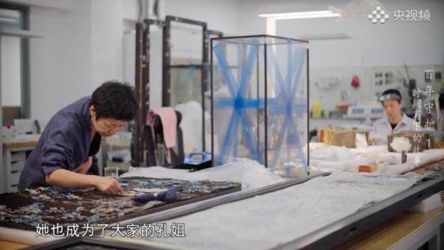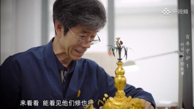 正片中,在演員宋佳的解說下,第一集《時間寫下的故事》開講,觀眾驚喜地發(fā)現(xiàn),太和殿前又見“老友”。2016年1月,紀錄片《我在故宮修文物》播出,故宮博物院文物修復部的匠人們連同凝結在器物上的智慧、匠心,成為當時的“頂流”。近十年過去,許多觀眾熟悉的面孔已退休,但并未離開。《百年守護》的第一組“主角”是文物修復的師徒:銅器組的王有亮、呂團結與徒弟們一起修復太和殿廣場上的鎏金銅缸;鐘表組的王津帶著徒弟們將故宮修復技藝傳播至西藏;書畫組的徐建華曾跟隨師父修過《清明上河圖》等名畫,半個多世紀后,他成了徒弟們的“定海神針”;在木器組,史連倉接父親的衣缽已在故宮工作了40年,而今他和謝揚帆是師徒亦如父子;鑲嵌組曾面臨斷代危機,是孔艷菊把隊伍從最少時的兩人發(fā)展壯大到了12人……