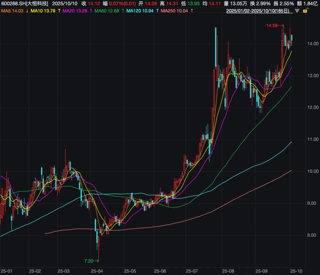從股價(jià)表現(xiàn)看,8月初拍賣(mài)結(jié)果公布后,大恒科技股價(jià)單日下跌8.71%,次日漲停,9月以來(lái)迎來(lái)一波上漲。截至10月10日,報(bào)收于14.12元/股,今年以來(lái)漲幅達(dá)65.34%,最新總市值62億元。