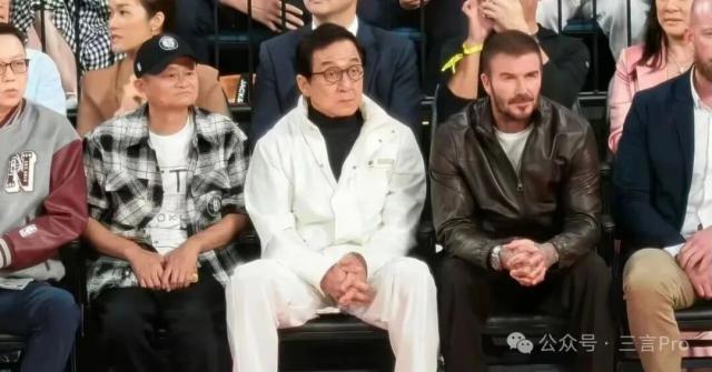 馬云穿著休閑裝,戴著棒球帽,身旁坐著成龍、貝克漢姆等知名人物。賽場(chǎng)內(nèi)還匯聚了姚明、奧尼爾、林書(shū)豪、梁朝偉劉嘉玲夫婦、梁詠琪等眾多娛樂(lè)和體育界人士,現(xiàn)場(chǎng)可謂星光熠熠。