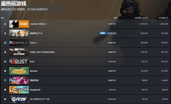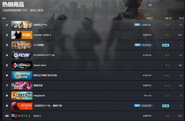 《戰(zhàn)地 6》正式發(fā)布當(dāng)天就榮登 Steam 銷售冠軍寶座,同時在線人數(shù)峰值達(dá)到 74.7 萬,在熱度排行榜上位居第二,僅次于免費(fèi)游戲 CS2。