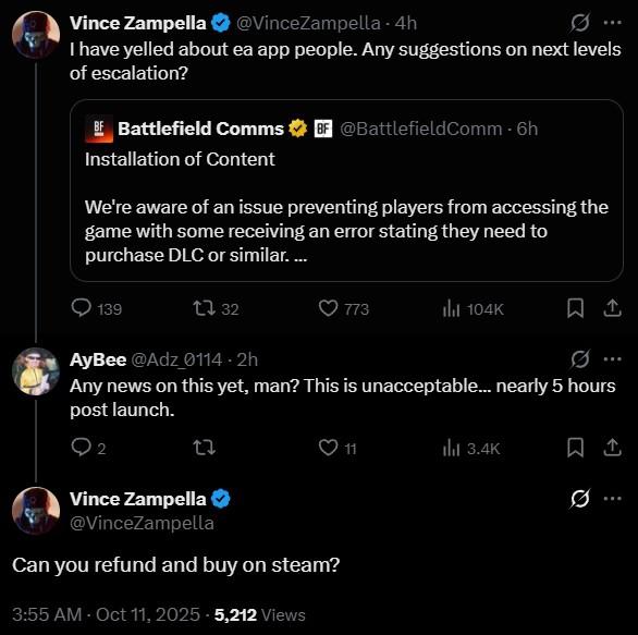 玩家在 EA 自家的數(shù)字發(fā)行平臺 EA App 上遇到了游戲內(nèi)容無法解鎖的問題,Vince 直言自己的《戰(zhàn)地 6》首發(fā)日是在 Steam 平臺上度過的。