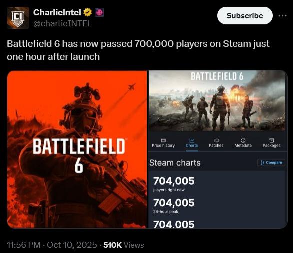 有人預(yù)測,隨著周末游戲高峰的來臨,《戰(zhàn)地 6》在 Steam 上的同時在線人數(shù)可能會突破百萬,這將讓本就不堪重負(fù)的游戲服務(wù)器面臨前所未有的壓力。