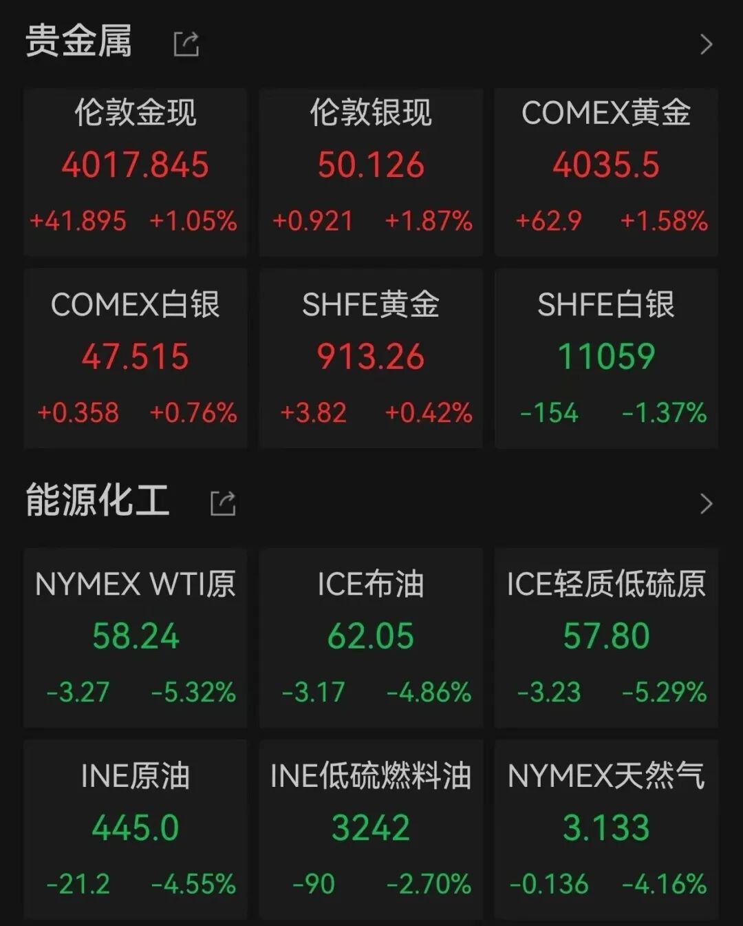 貴金屬方面,截至收盤,倫敦現(xiàn)貨黃金價(jià)格漲幅超1%,報(bào)4017.845美元/盎司;COMEX黃金期貨漲幅超1%,報(bào)4035.5美元/盎司;倫敦現(xiàn)貨白銀價(jià)格漲幅近2%。