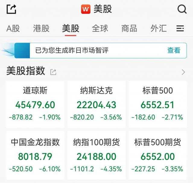 道瓊斯工業(yè)平均指數(shù)暴跌878.82點,跌幅達1.9%,收于45,479.60點;標普500指數(shù)下挫2.71%,收報6,552.51點,創(chuàng)下自4月10日以來的最大單日跌幅;納斯達克綜合指數(shù)重挫3.56%,收于22,204.43點,盤中還一度創(chuàng)下歷史新高,但隨后迅速反轉(zhuǎn)下跌。