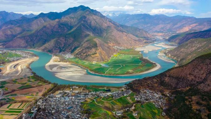 長(zhǎng)江在玉龍納西族自治縣石鼓鎮(zhèn)突然轉(zhuǎn)向,形成罕見(jiàn)的“V”字形河道,即“長(zhǎng)江第一灣”。