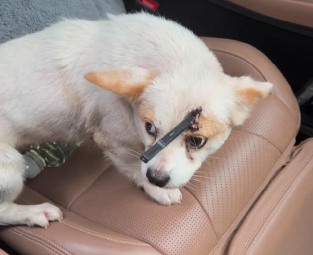 店鋪視頻顯示,這只受傷小狗額頭前方、左眼上部被插入疑似弓箭的異物。經(jīng)店方初步檢查,該疑似弓箭深度貫穿小狗整個(gè)腦袋,手術(shù)之后已取出,取出的疑似弓箭還帶有倒刺。“目前手術(shù)很順利,我們給小狗取名白雪?!?/p>