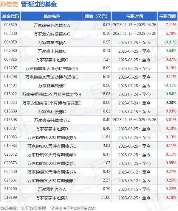 孫佳佳女士是中國國籍,擁有研究生學(xué)歷、碩士學(xué)位。她曾擔(dān)任立信會(huì)計(jì)師事務(wù)所 ( 特殊普通合伙 ) 國際業(yè)務(wù)一部審計(jì)員,以及中誠信證券評(píng)估有限公司公共融資部及評(píng)級(jí)技術(shù)與質(zhì)量管理部分析師等職務(wù)。2019年11月,孫佳佳入職萬家基金管理有限公司,現(xiàn)任固定收益部基金經(jīng)理,也曾歷任固定收益部研究員。在2023年11月15日至2025年6月26日,她擔(dān)任萬家鑫安純債債券型證券投資基金基金經(jīng)理;2025年04月15日起,擔(dān)任萬家雙利債券型證券投資基金基金經(jīng)理;2025年7月25日開始,擔(dān)任萬家鑫豐純債債券型證券投資基金基金經(jīng)理。